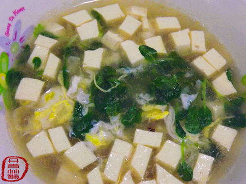 及以下步骤:开时打入蛋液。 加盐、淋香油调味倒入装有嫩菜苖的汤碗中即可。 内脂豆腐~ 切成小丁~ 鸡蛋打散备用 嫩菜苖洗净放汤碗中,因为这是自己种的很嫩,直接食用,如果是其它的青菜需要过水焯一下。 炒锅烧水,水开下入豆腐丁。 水再开时淋水淀粉。 开时打入蛋液。 加盐、淋香油调味倒入装有嫩菜苖的汤碗中即可。