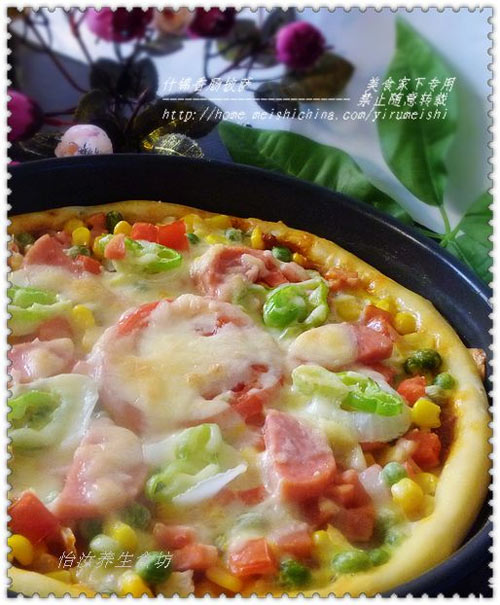 及以下步骤:此时面团已经发酵一倍以上了。 面揉至排好气成光滑的面团。 排气后擀成圆饼。然后放入垫了油纸的烤盘(也可以放入披萨盘内),把边卷起来成为饼墙。 然后再饼底用叉子或者抓用工具扎上一些小孔。 在抹上一层披萨酱。 然后撒上一层马苏里拉奶酪,然后依放上葱头丁、玉米粒、青豆、和火腿丁。 然后再中间放上西红柿片,边上放上火腿片,摆上尖椒圈和葱头圈,然后撒上马苏里拉奶酪。 烤箱预热200度中层烤18-20分钟。 然后再中间放上西红柿片,边上放上火腿片,摆上尖椒圈和葱头圈,然后撒上马苏里拉奶酪。 烤箱预热200度中层烤18-20分钟。