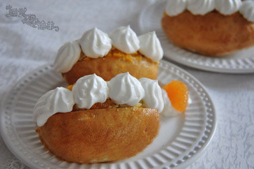及以下步骤:取一个面团,用手掌压扁成圆形。 将圆形下面约1/3的面积往中间折。 上面的1/3往下折,并且边折边捏紧。 最后收口都捏紧,自然地成为了一个橄榄形。 收口朝下,放在铺了烘焙纸的烤盘上,第二次发酵。因为我要去上课,所以扔冰箱发酵了4小时,然后再在室温下发酵约2小时。如果有时间的话,第二次发酵可以在28度环境下进行,约1小时。但是酵母的量就得按上限给。 发酵好的面团有明显的体积增长。刷上蛋液。放入预热好的烤箱,180度,约16分钟。 烤好的面包拿出来等凉。 布丁部分的具体操作过程见http://home.meishichina.com/space-298117-do-blog-id-219841.html。稍微不同的是,我们这里需要比较“固体”的布丁。在布丁做好后,关火,筛入淀粉约10 g,搅拌均匀,然后再开火,不停搅拌,直到成为不再是液态的布丁为止。有需要的话再多加淀粉。 罐头香橙沥干。用罐头是因为自己剥的橙子还要去皮去筋,不怕麻烦的话,用新鲜橙子当然也好。然后用勺子拌到布丁里去,并且适量压碎。形态完全不是液体的,因为一会要拿这个夹面包吃。 为了有卖相,上面用菊花头挤出打发好的奶油。吃多少做多少,不然面包的口感会不好。