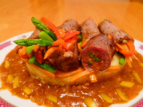 及以下步骤:薯蓉的做法:将土豆洗净连皮蒸40分钟,稍凉后,去皮放入食品袋加入有盐牛油50g,按压搅匀。 黑椒汁的做法:热锅下牛油。 下洋葱碎,黑胡椒碎。 加茄汁炒香,再加一勺面粉。 加清汤、红酒至浓稠,加盐、糖即成为黑椒汁。 码放:按序把薯蓉、杂菜条(留下来的)和牛肉卷摆好,淋上黑椒汁,再放黄椒碎作装饰。 下洋葱碎,黑胡椒碎。 加茄汁炒香,再加一勺面粉。 加清汤、红酒至浓稠,加盐、糖即成为黑椒汁。 码放:按序把薯蓉、杂菜条(留下来的)和牛肉卷摆好,淋上黑椒汁,再放黄椒碎作装饰。