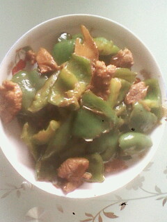 5、等肉熟后放入青椒炒一会六成熟,放入盐,鸡精调味,