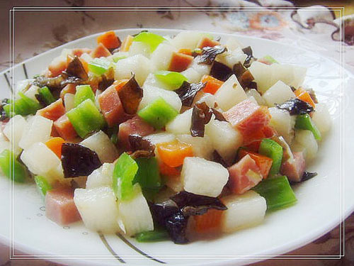 及以下步骤:锅中油热后放葱姜爆香,然后放入山药丁翻炒几分钟。 再放入切好的胡萝卜丁。 再依次放入火腿丁、青椒丁略炒。 最后放入木耳丁,加盐、鸡精、白糖调味,滴几滴香油即可出锅。 培根火腿切成方丁。 葱切葱花,姜切细丝。 锅中油热后放葱姜爆香,然后放入山药丁翻炒几分钟。 再放入切好的胡萝卜丁。 再依次放入火腿丁、青椒丁略炒。 最后放入木耳丁,加盐、鸡精、白糖调味,滴几滴香油即可出锅。