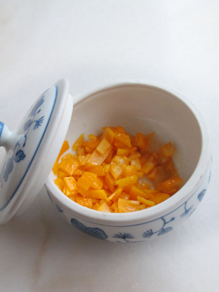 腌好的甜橙丁可以冷藏,煮银杏、白木耳、玉米、鸡蛋等清甜的糖水时可以下一些,有一股清香的橙味。