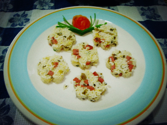 及以下步骤:7)最后,在炒好的米饭里,撒上香葱,翻炒均匀。 8)用做饼的小模具将炒好的米饭放进去压紧。然后轻轻拿出来,呵呵,花式炒饭就形成了。很特别吧。这款炒饭特别招不爱吃饭的小朋友喜欢。 9)将做好花形的炒饭一个一个的放到大碟里,以吸引小朋友的眼球增加食欲。 3)炒锅里放油烧热,然后放午餐肉丁下去炒香。 4)炒香午餐肉丁以后放雪菜下去一起炒香。 5)这一步把米饭放下去一起炒,并加盐和鸡精,翻炒均匀。 6)在炒好的香饭中间打入两个鸡蛋,并按顺时针方向搅匀,这样鸡蛋就很均匀的粘在米饭上了。 7)最后,在炒好的米饭里,撒上香葱,翻炒均匀。 8)用做饼的小模具将炒好的米饭放进去压紧。然后轻轻拿出来,呵呵,花式炒饭就形成了。很特别吧。这款炒饭特别招不爱吃饭的小朋友喜欢。 9)将做好花形的炒饭一个一个的放到大碟里,以吸引小朋友的眼球增加食欲。