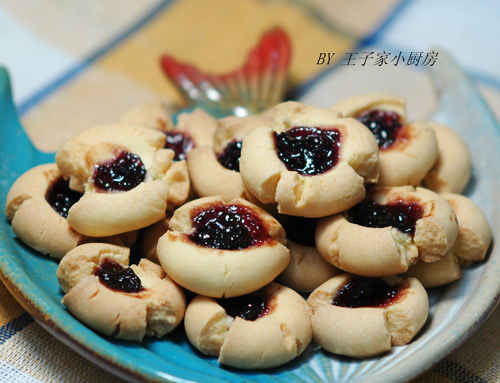 6、蓝莓玛格丽特做法就是送烤箱前,在裱花袋里装入蓝莓酱,在小饼干上方的小坑里挤进蓝莓酱就行了!