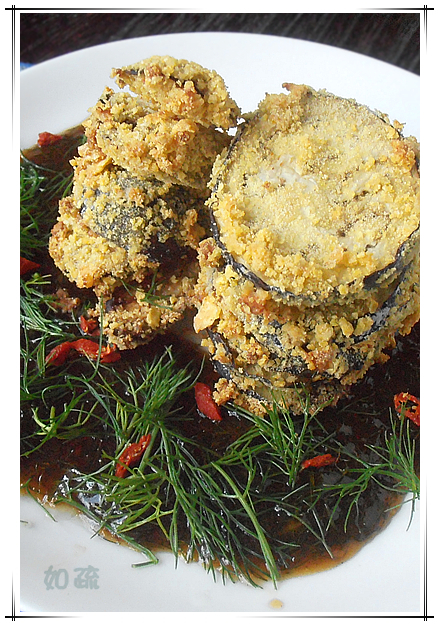 及以下步骤:再把一部份切碎的茴香菜入锅内稍炒,倒入调好的糖、醋、蒸鱼豉油、水淀粉汁勾芡,入剪成圈儿的枸杞,淋少许麻油; 停火稍晾,再加入余下切碎茴香菜; 将裹好玉米碎的茄片、菇片入预热好200度的烤箱内,烤10分钟左右至金黄发脆,取出装碟,周围浇茴香菜汁蘸食即可。 玉米片用搅拌机研磨杯打成碎片; 茄子、香菇切片粘以面浆,再裹以碎玉米片; 将茄片、香菇片上的玉米碎轻轻压实放置; 起锅烧热,入凉橄榄油,加入分开的八角爆香,再入郫县豆瓣炒香; 再把一部份切碎的茴香菜入锅内稍炒,倒入调好的糖、醋、蒸鱼豉油、水淀粉汁勾芡,入剪成圈儿的枸杞,淋少许麻油; 停火稍晾,再加入余下切碎茴香菜; 将裹好玉米碎的茄片、菇片入预热好200度的烤箱内,烤10分钟左右至金黄发脆,取出装碟,周围浇茴香菜汁蘸食即可。