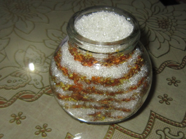 4、准备一干净无油无水的玻璃瓶,一层糖一层桂花摆放,压紧,最后用糖封口,一周后可食用。做好的糖桂花需放冰箱保存,可以保存好几年不坏。