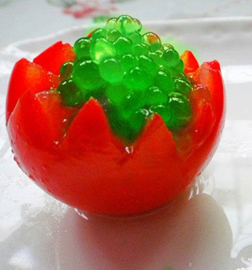 及以下步骤:将番茄用v型刻刀打开并掏空。 准备好材料,将海藻胶加入苹果味饮料中,钙加入纯净水搅拌均匀。 将番茄用v型刻刀打开并掏空。 准备好材料,将海藻胶加入苹果味饮料中,钙加入纯净水搅拌均匀。 将番茄用v型刻刀打开并掏空。 准备好材料,将海藻胶加入苹果味饮料中,钙加入纯净水搅拌均匀。 将番茄用v型刻刀打开并掏空。 用针管吸取苹果汁一点一点滴入钙水中。 滴完后捞出在清水里泡片刻即可。 装入番茄盅即可。