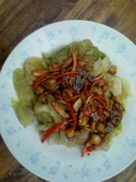 4、生菜装盘,将炒好的干贝淋上。