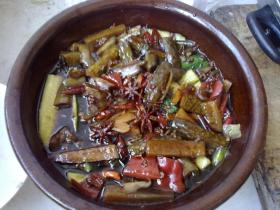 3、把需要腌制的蔬菜码好入坛,然后锅中热油,放入干辣椒、葱、姜、八角、姜片煸香,再放入酱油、料酒、白糖,等酱油沸腾后加入鸡精少许,把熬好的汤汁浇入即可,1天后就可以食用了。