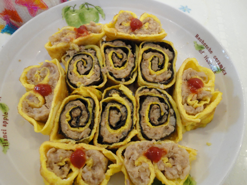 及以下步骤:鸡蛋,加入少许的淀粉一起搅匀.摊成鸡蛋饼备用. 把新鲜的猪肉馅放在碗里调味.加葱姜水的时候,一定要一点一点的加,一边加一边搅拌,直到肉馅起劲,这样才口感好.放入适量的盐和鸡精,料酒,香油一起搅拌. 鸡蛋,加入少许的淀粉一起搅匀.摊成鸡蛋饼备用. 把新鲜的猪肉馅放在碗里调味.加葱姜水的时候,一定要一点一点的加,一边加一边搅拌,直到肉馅起劲,这样才口感好.放入适量的盐和鸡精,料酒,香油一起搅拌. 鸡蛋,加入少许的淀粉一起搅匀.摊成鸡蛋饼备用. 把新鲜的猪肉馅放在碗里调味.加葱姜水的时候,一定要一点一点的加,一边加一边搅拌,直到肉馅起劲,这样才口感好.放入适量的盐和鸡精,料酒,香油一起搅拌. 鸡蛋,加入少许的淀粉一起搅匀.摊成鸡蛋饼备用. 开始卷蛋饼了,我用了两种卷法,两种口味.一种是铺上一张海苔,加上肉馅,直接卷成卷.一种是直接用蛋饼加上肉馅,从两边同时卷,卷到中间用剩下的蛋液封住口. 水开以后,蒸十五分钟就可以了,要中小火,火不要太大. 蒸好后,稍稍晾一下,直接切成段摆盘就可以吃了,为了好看,我用蕃茄酱做了点缀。