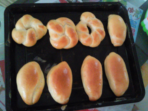 5、松弛后给面包造型。喜欢做啥花样就动手吧。面包造型完毕后放在烤盘上放温暖处进行最后发酵。