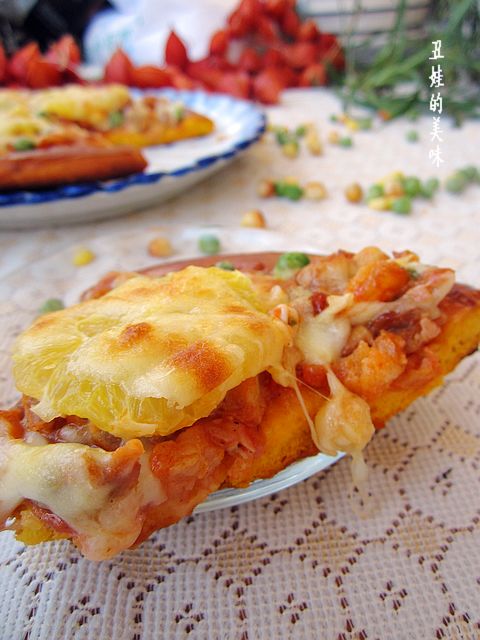这是参赛的最后一款比萨,饼底的面团中加入了甜甜、面面的窝瓜,颜色金黄,营养丰富。 馅料中不仅添加了cook100烤五花肉、青豆、玉米粒、松子仁,更加入了薄薄的橙片,别有一番风味儿。