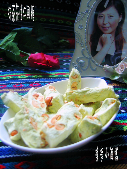 去食品一店忽然看见抹茶花生牛轧糖,一看价格超贵哦。呵呵,回到家就迫不及待地山寨了一把。 抹茶(matcha)粉含有丰富的人体所必须的营养成分和微量元素,其主要成分为茶多酚、咖啡碱、游离氨基酸、叶绿素、蛋白质、芳香物质、纤维素、维生素c、a、b1、b2、b3、b5、b6、e、k、h等,微量元素钾、钙、镁、铁、钠、锌、硒、氟等近30余种。