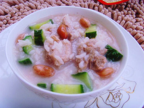 及以下步骤:然后加入大米中小火煲40分钟成粥。 最后加入黄瓜块即可。 大米淘洗干净沥干水分,然后加盐。 再加色拉油腌20分钟。 排骨洗净斩小块,放入沸水中氽烫,然后捞出洗净。 黄瓜洗净后切小块。 花生洗净,姜切片备用。 锅内加水,放入花生、姜片、排骨大火煮开。 然后加入大米中小火煲40分钟成粥。 最后加入黄瓜块即可。