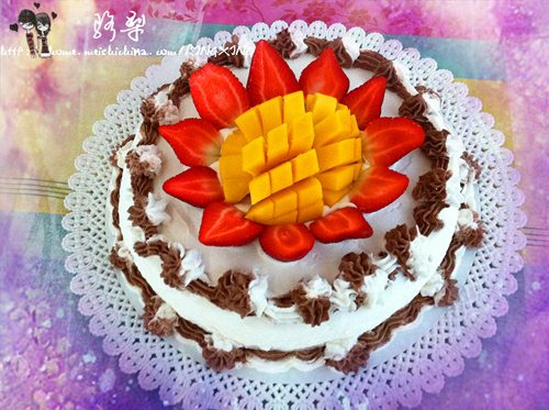 及以下步骤:剩下的奶油一半我加了可可粉拌成棕色和另外一半的白奶油一起放入裱花袋挤出双色花边。 中间放上芒果,草莓围着芒果放好。完工...... 草莓对半切开,芒果斜刀切好。 准备好蛋黄酱。具体可以看我的日志。 把戚风蛋糕分割成3片。 用糖水把蛋糕片打湿。 均匀抹上香草蛋黄酱。 撒上一层可可粉,这样味道会更有层次感。如此两层。 剩下的奶油一半我加了可可粉拌成棕色和另外一半的白奶油一起放入裱花袋挤出双色花边。 中间放上芒果,草莓围着芒果放好。完工......