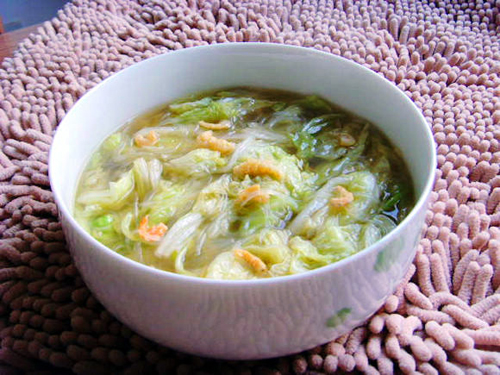 寒冷的冬季,清汤寡水更健康 此汤汤清味鲜,加了粉丝后更加的爽口 白菜具有较高的营养价值,含有丰富的多种维生素和矿物质 对于护肤养颜、润肠排毒、促进人体对动物蛋白的吸收都有极大功效 海米含有丰富的蛋白质和矿物质,还含有丰富的钙跟镁元素 适应人群:动脉硬化、高血压及心肌梗死患者