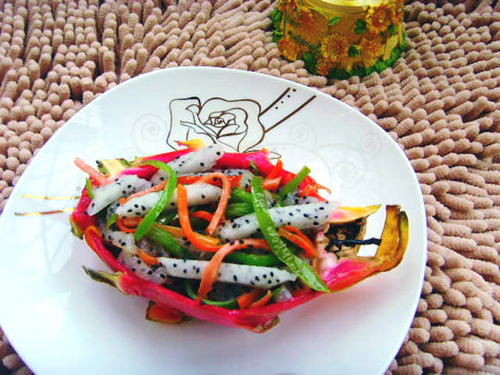 及以下步骤:将蒜切片。 锅内热油爆香蒜片,倒入胡萝丝。 再倒入火腿丝、青椒丝翻炒。 淋入香油后放入火龙果小心炒匀。 加盐、白胡椒粉调味。 盛到火龙果壳内即可。 再倒入火腿丝、青椒丝翻炒。 淋入香油后放入火龙果小心炒匀。 加盐、白胡椒粉调味。 盛到火龙果壳内即可。