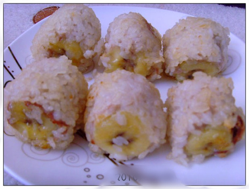 厨房带给人世俗的快乐,爱厨房的人是幸福的。 因为做菜既有创作的乐趣,又有温情的分享。 当一堆普通的原料魔术般的变成一道道美味佳肴时让人很有成就感。 而一桌被吃的精光的美食带给品尝者的是浓浓的爱意,又是对创作者最好的奖赏。 今天做的是一道西式快餐。 虽然制作稍稍花点时间,但结果一定会让你觉得物有所值。 肉能买到切好的肉片最好不过了。 如果买不到,将肉速冻一会更容易切成薄片的。 因为我这里没有冰箱,哈哈,将就着切的。 这次因为时间有限,所以我将肉片卷到香蕉段上后,直接在外面洒了层盐。 如果时间充足,可以将肉片两面洒上盐和胡椒粉腌制10分钟。 米饭不能蒸的太硬,不然不容易包裹在外面,并且米饭尽量用热的。 其实完全可以用面包糠代替米饭的,这就要根据个人意愿了。