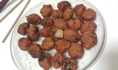 5、包的时候我用手沾了点黑芝麻,黏在藕丸的外层,很漂亮。大家随意。一直是中小火炸,大火会使外面焦黑里面不熟。炸到外层焦黄,漏勺捞出控油,大火使油温到八成热放进藕丸复炸,外层变色后迅速捞出,要眼快手快。因为没吸油纸,我底下铺了层面包糠,吸吸油。那个是被我咬了一口尝尝味道的,哈哈哈,很美味哦。