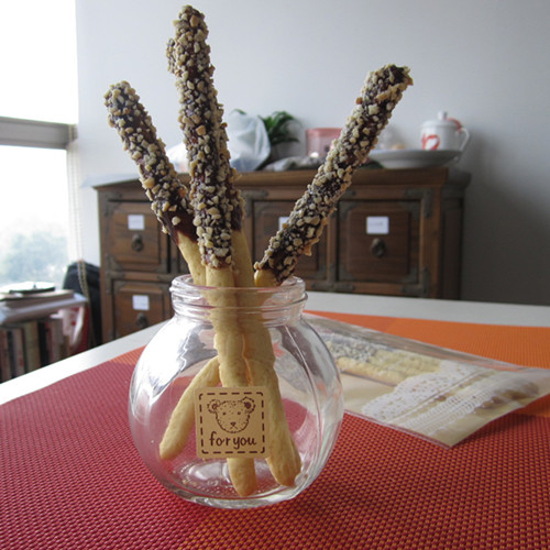 及以下步骤:烤箱150°预热放入杏仁碎,烤3-5分钟,表面微黄即可。装入保鲜袋,擀碎。 一头塗上巧克力酱,然后裹一层杏仁碎。 可以放入包装袋送人哦。 搅拌均匀,揉成表面光滑的面团。 擀开成薄片,“叠被子”(三折,重复3-4次) 切成0.5cm左右的长条。 长条搓圆,搓长放入烤盘,烤箱170°预热,烤十分钟。 烤箱150°预热放入杏仁碎,烤3-5分钟,表面微黄即可。装入保鲜袋,擀碎。 一头塗上巧克力酱,然后裹一层杏仁碎。 可以放入包装袋送人哦。