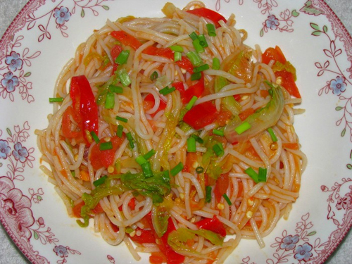 及以下步骤:锅里油好油,先炒泡椒,把泡椒的俺菜味儿炝掉。 再炒上白菜丝,翻两三下。 倒上蕃茄丁,翻炒,两分钟。 最后倒入米线翻炒,撒上适量盐。 装盘,表面撒上葱花。 成品图。 倒上蕃茄丁,翻炒,两分钟。 最后倒入米线翻炒,撒上适量盐。 装盘,表面撒上葱花。 成品图。