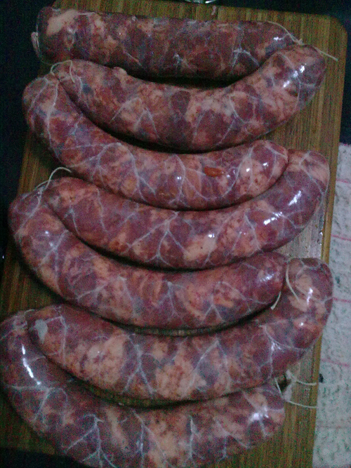 及以下步骤:右手拿住漏斗,将腌制好的肉用筷子夹取灌进漏斗,同时用右手轻轻挤压,使肉往下移动,每灌装10厘米肉,用左手顺着肠衣挤压推进肉往前,使其紧密,有空气时注意排气或者用针扎眼。每20-25厘米用棉线扎一段。 每灌装好4、5节,将端部扎紧,再灌另一段。灌好一种口味的再灌另一种口味的香肠。 灌好后,用锅烧热水,约40度左右,水里加入少量白酒,将灌好的香肠放入清洗表面的油脂后取出,控干。也可直接用浸泡热水的毛巾擦拭干净。 每两三节香肠用一棉线拴起,挂在铁钩上,再将钩挂在栏杆等阴凉通风处晾晒。香肠的制作就完成了。等晾晒15天左右,即可将香肠蒸或者煮着吃了,期待美味的香肠上桌吧! 将肉片分成两份,每份约6斤重,分别加入川味、广味香肠调料,加15克白酒,充分搅拌,使调料和肉混合均匀。静置1、2小时。 肠衣洗净,去掉上面的油筋,只要薄薄的半透明的外膜。我用的现成的,只需清水冲洗一下即可。将肠衣套在漏斗上(用矿泉水瓶子的上部分做成,口径刚好合适),肠衣要排去空气。端部暂不扎紧。 右手拿住漏斗,将腌制好的肉用筷子夹取灌进漏斗,同时用右手轻轻挤压,使肉往下移动,每灌装10厘米肉,用左手顺着肠衣挤压推进肉往前,使其紧密,有空气时注意排气或者用针扎眼。每20-25厘米用棉线扎一段。 每灌装好4、5节,将端部扎紧,再灌另一段。灌好一种口味的再灌另一种口味的香肠。 灌好后,用锅烧热水,约40度左右,水里加入少量白酒,将灌好的香肠放入清洗表面的油脂后取出,控干。也可直接用浸泡热水的毛巾擦拭干净。 每两三节香肠用一棉线拴起,挂在铁钩上,再将钩挂在栏杆等阴凉通风处晾晒。香肠的制作就完成了。等晾晒15天左右,即可将香肠蒸或者煮着吃了,期待美味的香肠上桌吧!