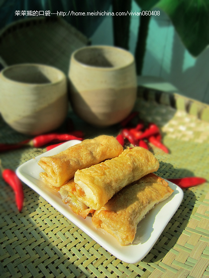及以下步骤:加生姜末,适量盐搅拌均匀,做成馅料。 蛋皮中加入适量拌好的馅料。 折好边角。 抹上蛋液封口。 油锅烧热,下入。 小火煎到两面金黄。 食用时,可以配喜欢的酱料。 油锅烧热,下入。 小火煎到两面金黄。 食用时,可以配喜欢的酱料。