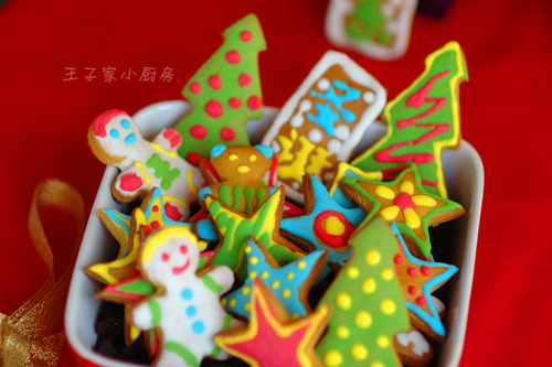 及以下步骤:在糖霜里加入不同颜色的食用色素,做成不同颜色的糖霜。刷底色的糖霜可以直接放在碗里刷好后装入裱花袋。 用毛刷蘸着糖霜刷底色 等糖霜干透再画第二层的线条或图案。 漂亮的圣诞姜饼完工了,一定要晾干收起哦! 包上一袋给儿子做送人的礼物赚足了面子! 在糖霜里加入不同颜色的食用色素,做成不同颜色的糖霜。刷底色的糖霜可以直接放在碗里刷好后装入裱花袋。 用毛刷蘸着糖霜刷底色 等糖霜干透再画第二层的线条或图案。 漂亮的圣诞姜饼完工了,一定要晾干收起哦! 包上一袋给儿子做送人的礼物赚足了面子!