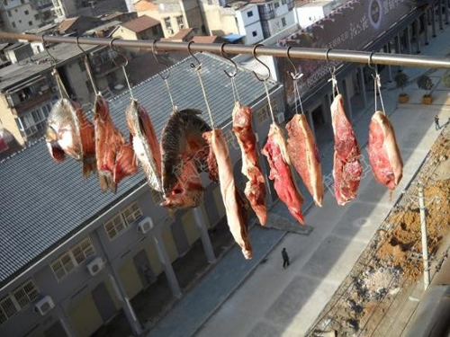 3、起缸晾晒的第一天,最好能见到太阳,这样制作的腊鱼、腊肉吃起来腊味十足,香味扑鼻。