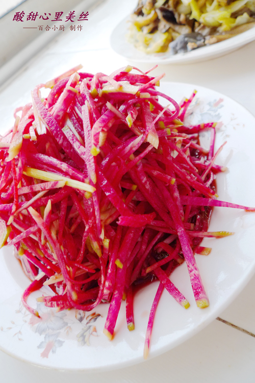 及以下步骤:心里美萝卜,去皮,用纯净水洗净,一切为二,取半个(约200克左右),切细丝,备用。 大葱取葱白部,切细丝。 心里美萝卜,去皮,用纯净水洗净,一切为二,取半个(约200克左右),切细丝,备用。 大葱取葱白部,切细丝。 心里美萝卜,去皮,用纯净水洗净,一切为二,取半个(约200克左右),切细丝,备用。 大葱取葱白部,切细丝。 将切好的葱白细丝,放在切好的萝卜丝上。 取一小碗,倒入3大勺香醋、1小勺生抽、3大勺白糖、1小茶匙料酒、1小茶匙鸡精,充分搅拌均匀,制成调味汁,备用。 将萝卜丝、葱白、调味汁依次倒入大碗中,滴入适量香油,拌匀。 拌匀后,即可装盘上桌。
