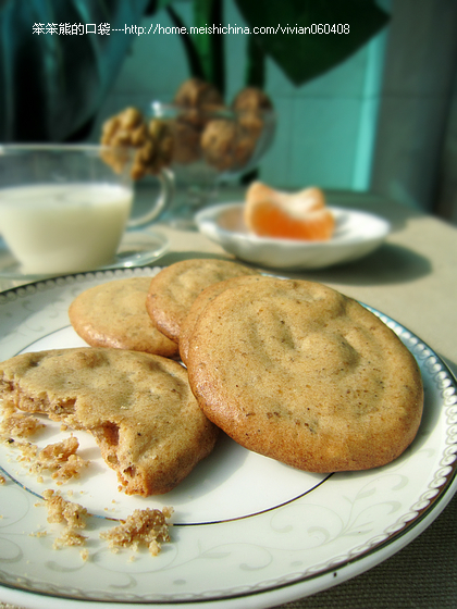 笨笨最近也开始学烘焙了,虽然目前水平还很低,但是请大家见证一下成长的过程。 这次渝、蜀行回来带了很多的核桃,质量还是满不错的哈,所以取了几颗做了这款小饼干。虽然饼干的样子丑了点,但是味道还是可以的。 营养成分 我们一般常吃的核桃仁中含蛋白质、脂肪以及碳水化合物,以及丰富的钙、磷、铁、锌和维生素等。1千克核桃仁与大约9千克牛奶、5千克鸡蛋或4千克牛肉的营养价值相当,100克核桃仁产生的热量是同等重量粮食的2倍。 可以说,核桃全身都是宝:其中的磷脂对脑神经有良好的保健作用;核桃油中所含的油酸和亚麻酸是不饱和脂肪酸,有防治动脉硬化的功效。孕妇多食核桃有利于婴儿大脑发育;儿童多食益智;成年人多食可润肤。 笨笨的小建议: 不论是哪种核桃,都不可贪多,因其本身热量比较高,过多食用又不能被充分吸收的话,就会被作为胆固醇储存起来,结果适得其反。一般来说,每天四五个核桃即可,同时应适当减少摄入其他脂肪,以免热量过高。