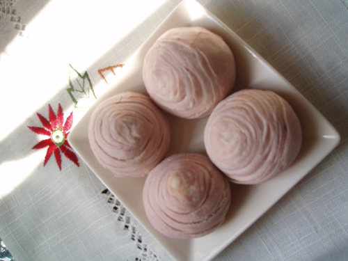 及以下步骤:取切开的面团切口朝上压扁擀圆。 反过来包入事先准备好的芋泥(即为切口的背面包芋泥噢),然后收口稍做整理。 烤箱220度预热,烤盘内铺油纸,将做好的芋泥酥放入烤盘内排好,放入烤箱中层以220度(原配方是180度,我家的烤箱温度偏低,所以我改为220度),烤25-30分钟即可(我用了30分钟)。 新鲜出炉的香芋酥真的好美,淡淡的紫,我真的好喜欢,做了20个,拿回老家,一下子就吃光啦,嬷嬷吃得好开心,说甜度适中,而且又软又绵。自己做的美食,得到家人的赞赏,这是最安慰,最值得开心的事!!! 再臭美一下。 取切开的面团切口朝上压扁擀圆。 反过来包入事先准备好的芋泥(即为切口的背面包芋泥噢),然后收口稍做整理。 烤箱220度预热,烤盘内铺油纸,将做好的芋泥酥放入烤盘内排好,放入烤箱中层以220度(原配方是180度,我家的烤箱温度偏低,所以我改为220度),烤25-30分钟即可(我用了30分钟)。 新鲜出炉的香芋酥真的好美,淡淡的紫,我真的好喜欢,做了20个,拿回老家,一下子就吃光啦,嬷嬷吃得好开心,说甜度适中,而且又软又绵。自己做的美食,得到家人的赞赏,这是最安慰,最值得开心的事!!! 再臭美一下。