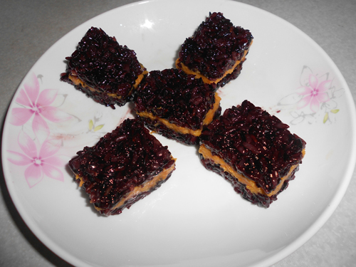 及以下步骤:用一个干净的袋子铺在盘子上,用一个模具【我用的是凤梨酥的模子】铺一层紫糯米,用一个小勺子抹油压平 放一层地瓜泥压平 在放一层紫糯米,就做成紫米糕了 地瓜切块,和紫糯米一起蒸熟 地瓜蒸熟后 地瓜压成泥加入牛奶拌匀 蒸好的糯米趁热加入糖,米酒拌匀 用一个干净的袋子铺在盘子上,用一个模具【我用的是凤梨酥的模子】铺一层紫糯米,用一个小勺子抹油压平 放一层地瓜泥压平 在放一层紫糯米,就做成紫米糕了