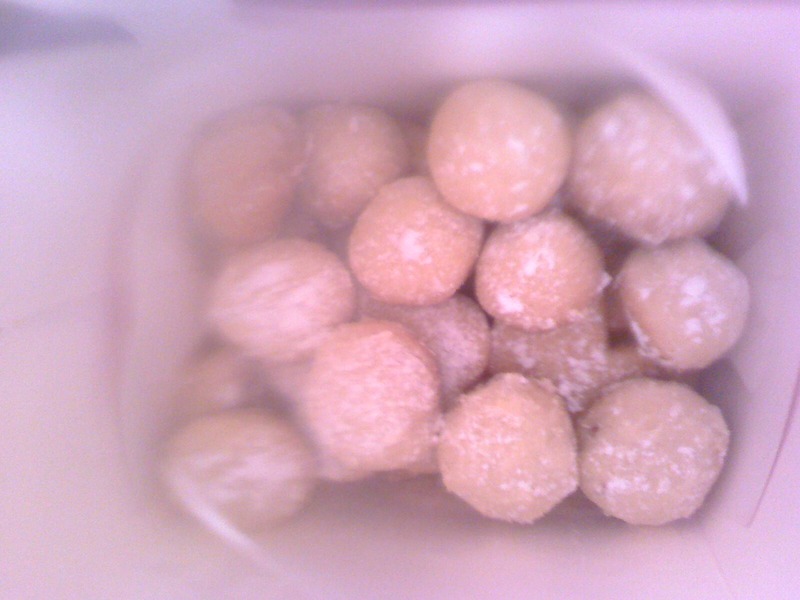 7、慢慢包住杏仁,再团成圆形(有的杏仁较尖长,可将尖角去掉)入烤箱中层,170度上火烤约15分钟左右,表面变成金黄色即可,取出趁热倒入装有糖粉的盘中滚几圈,使每个雪球都能均匀地沾满糖粉
