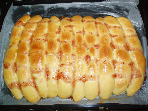 及以下步骤:取一个小面团,压扁,擀成牛舌形,沿长边慢慢卷起,整成两头略尖的长条。(这也忘记拍图啦,整手都是粉,不容易啊) 烤盘放一张油纸,把搓好的长条排在油纸上面,放入烤箱上层,底层放一盆热水,二次发酵。(40分钟左右)(这忘记拍图啦,只能发成品图) 发酵至2倍大。取出烤盘,同时预热烤箱,给面包刷上全蛋液,挤上果酱(我用的是草莓酱,非常香甜,也有试过用自制的苹果酱,味道也非常棒,沙拉酱也试过,不太感冒呢,呵呵),放入预热好的烤箱中上层,220度烤18分钟。 不停地搅拌锅底,煮至稠糊状,加入黄油拌匀,倒入碗中,放凉后盖保鲜膜入冰箱冷藏5小时以上。 面包制作: 面团放入盆里,盖保鲜膜,放温暖处发酵至2-2.5倍大。(我的做法是在电饭锅里放点温水,把盆放在水上面,盖上盖子,感觉保温效果还不错,冬日里,一个小时就可以发好) 取出面团,排气后称重,平均分成10个小面团,滚圆,盖保鲜膜二次发酵15分钟。 取一个小面团,压扁,擀成牛舌形,沿长边慢慢卷起,整成两头略尖的长条。(这也忘记拍图啦,整手都是粉,不容易啊) 烤盘放一张油纸,把搓好的长条排在油纸上面,放入烤箱上层,底层放一盆热水,二次发酵。(40分钟左右)(这忘记拍图啦,只能发成品图) 发酵至2倍大。取出烤盘,同时预热烤箱,给面包刷上全蛋液,挤上果酱(我用的是草莓酱,非常香甜,也有试过用自制的苹果酱,味道也非常棒,沙拉酱也试过,不太感冒呢,呵呵),放入预热好的烤箱中上层,220度烤18分钟。