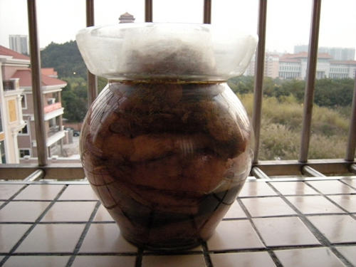 7、所有猪头肉都处理好,放入坛子中,剩下的调料汁和椒盐浇在最上层,密封。