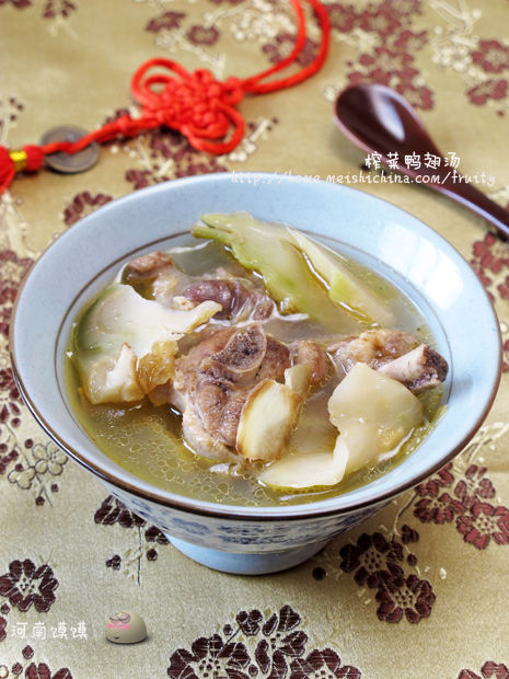 榨菜能利尿除湿,平衡体内的电解质,并抗菌解热,还能增加脑中氧气含量,提神醒脑且消除疲劳、抑菌止痛。 鸭肉滋阴补虚、益肺固肾、利水消肿,能提振阳气、滋润五脏,改善虚损性腰膝酸痛、喘促痰稀... 鸭肉性微寒,榨菜性温,两者加姜同煮能祛寒趋温,使这道汤品能适合普遍人群,特别是脑心过劳、房事过度、体力透支者可经常食用。