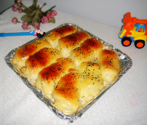及以下步骤:摆放在烤盘上,进行第二次发酵,我是直接在烤箱里发的,烤盘底下放上两碗开水,发40分钟。这个方法我是和薄灰学的。真的很不错。 将发好的面团刷上蛋液,撒上芝麻,175度预热,烤15分钟。 考好出炉了,大小正适合小朋友。 将扩展阶段的面团放到温暖的地方进行第一次发酵。冬天温度室温不均匀,我是在蒸锅上发的,蒸锅加水加热到35度左右,把面盆放到蒸屉上,盖上锅盖或包上保鲜膜。1个小时后,发到原来的2.5倍大,蘸面戳洞不会缩就好了。 将发酵好的面团排气后分成9等份,盖保鲜膜室温醒发15分钟。 把小面团按瘪排气后擀成长条状,放上发好的葡萄干,继续擀,让葡萄干和面贴合在一起。 顺一边卷曲。 摆放在烤盘上,进行第二次发酵,我是直接在烤箱里发的,烤盘底下放上两碗开水,发40分钟。这个方法我是和薄灰学的。真的很不错。 将发好的面团刷上蛋液,撒上芝麻,175度预热,烤15分钟。 考好出炉了,大小正适合小朋友。