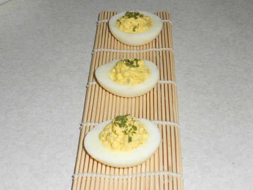 及以下步骤:鸡蛋先煮熟。 剥皮对半切。 鸡蛋先煮熟。 剥皮对半切。 鸡蛋先煮熟。 剥皮对半切。 取出蛋黄,压碎加入洋芹菜。 加入沙拉酱拌匀。 装入塑胶袋,一角剪一个小口。【有挤花袋也可以用挤花袋】 挤入蛋黄的位置,撒上洋芹菜就可以了。