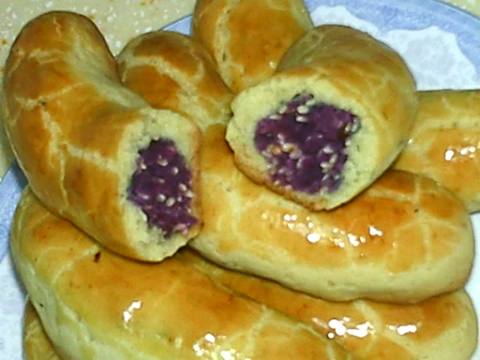 及以下步骤:掐6个小剂。 将熟花生米碾碎,和熟芝麻一起倒入紫薯泥,拌匀。 把馅料也下6个小剂。 取一块小皮面,摁成中间厚的扁圆形,放入馅料。 把馅料包好。 搓成长10厘米,两头尖,中间粗的长条状,略弯曲成香蕉形。 放入烤盘,找好距离,均匀地刷上蛋液,略晾。 烤箱预热180度,将烤盘送入烤箱,中下层,调整温度至200度,待制品定型后,调整温度至180度,中层,烤成表面金黄色,有蛋液的光亮,底面红褐色,熟透取出。 冷却后摆盘食用。 冷却后摆盘食用。
