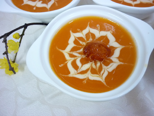 7、把烧好的淡奶装入裱花袋,在木瓜汁上挤出图案。