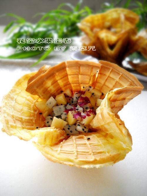 及以下步骤:搅拌均匀,滤出杂质。 模具预热。 在模具上刷上植物油。 将适量面糊舀入烤盘。 合上模具,加热。揭开看看,颜色发生变化即可翻转一面加热。 加热过程中,注意观察。刚开始有热气冒出,随后就会感觉到模具因蛋奶糊膨胀而被顶起。蛋卷皮会因为温度升高,颜色越来越深。 用手揭起蛋皮,五指合拢,捏成包裹状。 准备好水果。 水果切开,取出果肉,切小粒备用。 拌好的水果粒,倒入蛋卷中。