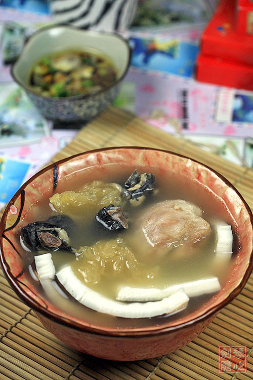 6、将焯好的鸡、瘦肉、椰子、银耳一起入锅加水烧开,文火炖1小时。