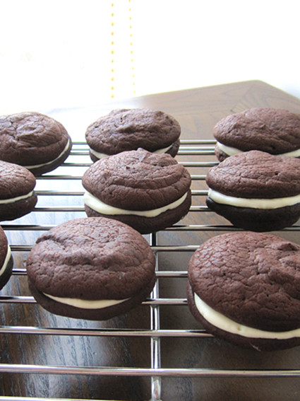 及以下步骤:把面糊装裱花袋,用大号圆孔裱花嘴挤出圆形面糊(间隔稍大点)烤箱预热200° 放入中层烤10分钟,冷却备用。 奶油奶酪室温软化,加糖粉,充分打发,成蓬松顺滑状态,分2-3次加淡奶油,充分搅打至适合的浓稠程度(淡奶油不一定加完)。 装裱花袋挤在冷却好的一片底部。 盖上另一片即可。 在3中倒入1/3牛奶,1/3混合粉类,用刮刀拌匀。 重复序5的制作,直达全部加完,成光滑面糊。 把面糊装裱花袋,用大号圆孔裱花嘴挤出圆形面糊(间隔稍大点)烤箱预热200° 放入中层烤10分钟,冷却备用。 奶油奶酪室温软化,加糖粉,充分打发,成蓬松顺滑状态,分2-3次加淡奶油,充分搅打至适合的浓稠程度(淡奶油不一定加完)。 装裱花袋挤在冷却好的一片底部。 盖上另一片即可。