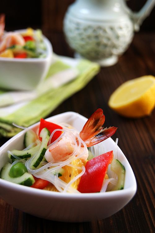 及以下步骤:虾仁投入冰水中至凉透后沥干水。 取大碗,将黄瓜片、橙子角、红彩椒片、粉丝、虾仁、豌豆拌匀,淋上适量沙拉汁即可。 将所有调味料放入碗中混合均匀制成沙拉汁。 粉丝用沸水浸泡10分钟,豌豆用沸水锅煮熟,捞出晾凉;沥干水分,拌入一半做好的沙拉汁中腌制20分钟。 红彩椒洗净,去蒂、籽,切成菱形片。 黄瓜横切为两瓣,取出中间瓜瓤部分,切片。 橙子去皮,切成角备用。 虾去壳去虾线,留尾做成虾球;入沸水中焯烫至熟,捞出。 虾仁投入冰水中至凉透后沥干水。 取大碗,将黄瓜片、橙子角、红彩椒片、粉丝、虾仁、豌豆拌匀,淋上适量沙拉汁即可。