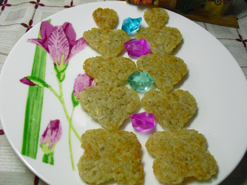 及以下步骤:入烤箱200度烤约15分钟至金黄后出炉。 原料图。 将米饭与面粉充分混合。 原料图。 将米饭与面粉充分混合。 混合好的米饭倒入植物油。 加入盐、胡椒粉、孜然粉。 装入保鲜袋中用手压实。压实后用擀面杖将其擀平。 用模具刻出喜欢的样子,放入铺好油纸的烤盘中。 入烤箱200度烤约15分钟至金黄后出炉。
