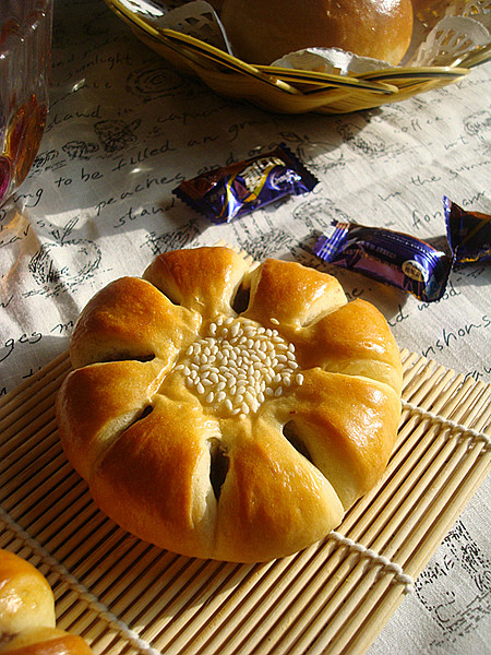 及以下步骤:放入烤箱,再发酵10分钟后刷蛋液,洒上白芝麻。 烤箱175度预热,中层烤制15分钟,出炉。 高筋粉200g、低筋粉20g、奶粉15g、白砂糖25g、盐3g、干酵母3g、鸡蛋25g、水115g放入面包机内,搅拌成团。 放入黄油搅拌至面团延展,发酵面团至2倍大。 一次发酵结束后,将面团分成7分,滚圆,松弛15分钟。 取一面团擀成饼状包入红豆馅儿。 依次做好所以面包坯。 二次发酵一倍大,按扁,用剪刀剪开,呈花瓣状。 放入烤箱,再发酵10分钟后刷蛋液,洒上白芝麻。 烤箱175度预热,中层烤制15分钟,出炉。