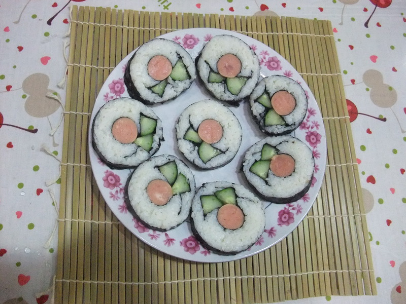 及以下步骤:将米饭均匀的铺一层在海苔上,中间部分多加一块长方形的米饭。 在米饭上再盖上一张海苔,用一根筷子在长方形中间压一下,使其分开成两个条状。 将米饭均匀的铺一层在海苔上,中间部分多加一块长方形的米饭。 在米饭上再盖上一张海苔,用一根筷子在长方形中间压一下,使其分开成两个条状。 米饭加适量寿司醋和糖,拌匀寿司帘铺上保鲜膜,放上一张海苔。 将米饭均匀的铺一层在海苔上,中间部分多加一块长方形的米饭。 在米饭上再盖上一张海苔,用一根筷子在长方形中间压一下,使其分开成两个条状。 依次放上火腿肠和黄瓜。 用力卷好,因为材料比较多,所以卷的时候有些费力,为防止松开,卷好后握一会儿再打开。 切好,装盘。怎么样?是不是有些像小花。