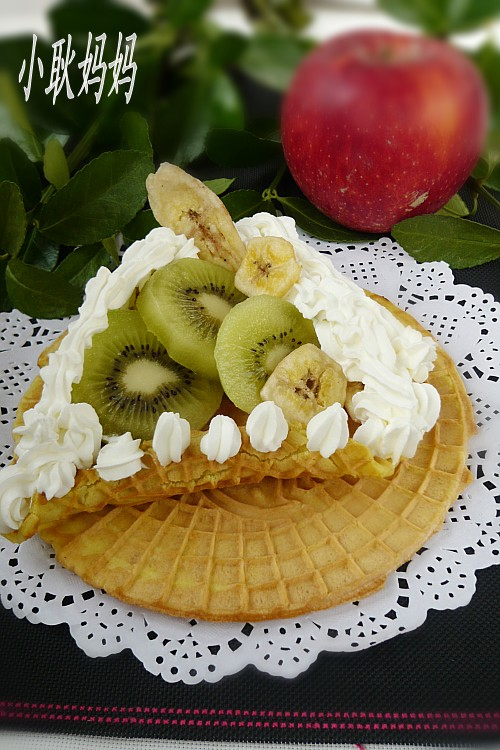 及以下步骤:烤盘刷上一层色拉油。 加上一点面糊。 两面合上小火煎至两面金黄色。 趁热从两面卷起来成扇形。 猕猴桃去皮切片。 淡奶油加白糖20克打发待用。 在做好的扇形蛋卷上摆上水果。 挤上淡奶油就可以。 在做好的扇形蛋卷上摆上水果。 挤上淡奶油就可以。